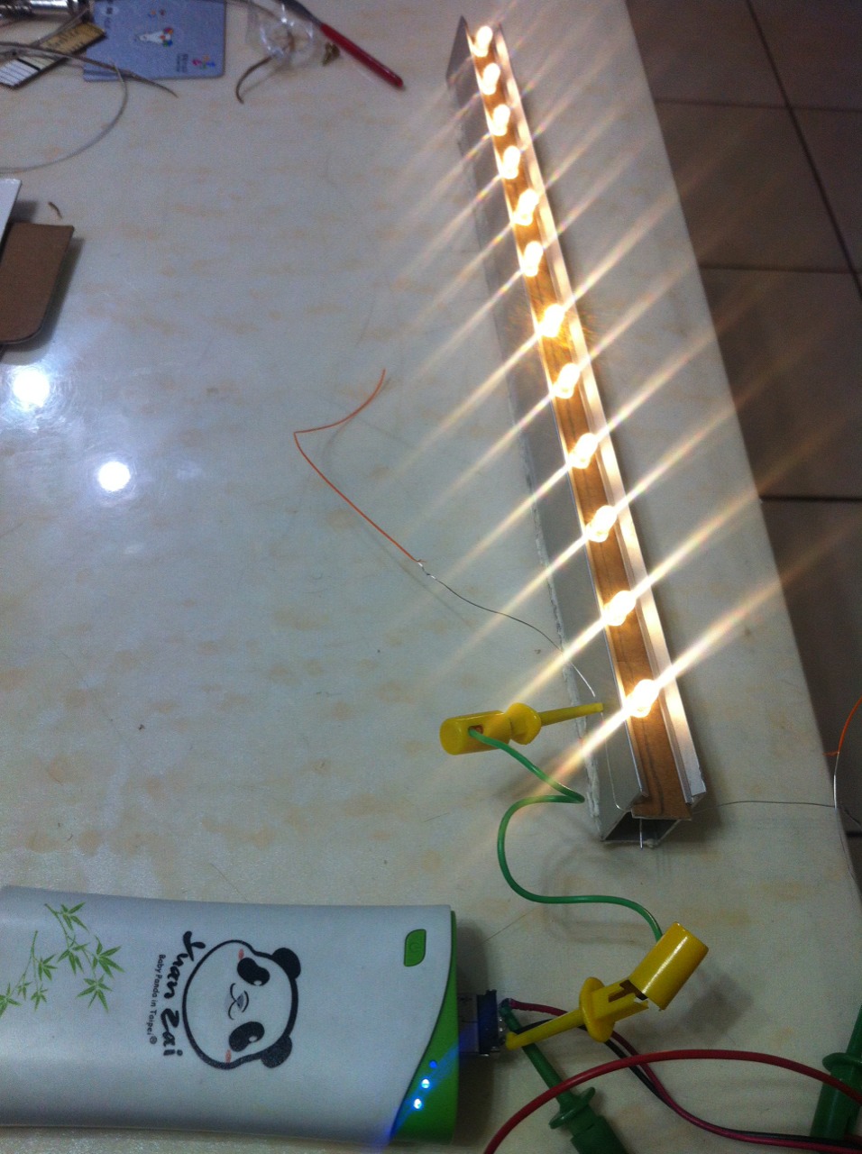 小弟先跟鴻旗要了一條鋁擠型,用厚紙板當底做了一條用行動電源點亮的LED燈條。
